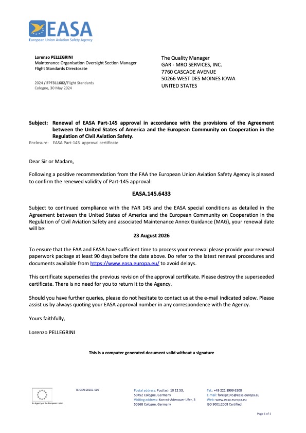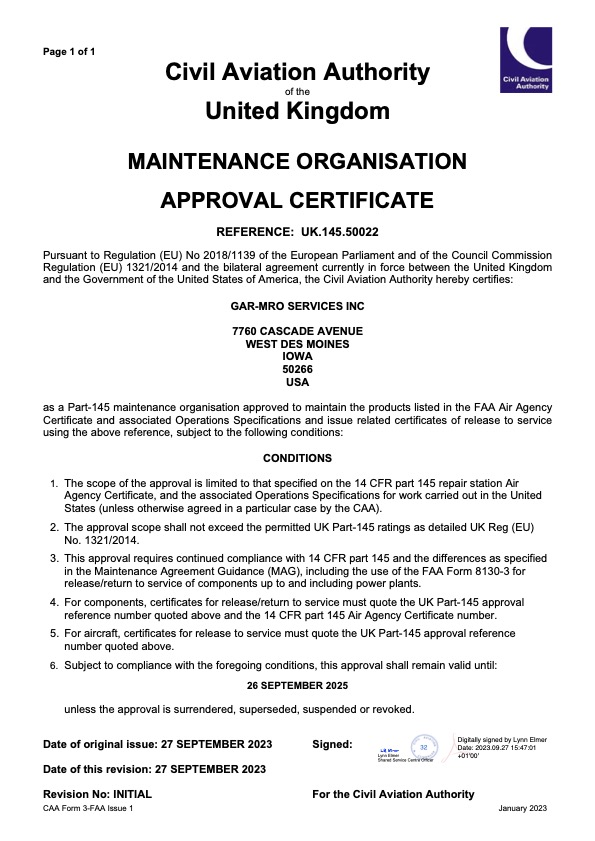 Since 2012, GAR-MRO Services, Inc. has served the aviation repair industry. We are an FAA, EASA, and UK CAA certified Part-145 repair station partner of choice. Our team is comprised of well-trained technicians focused on achieving the highest quality standards. Our state-of-the-art equipment and adherence to strict quality standards ensures our customers are delivered highly reliable products. We are proud to serve commercial, corporate and private operators.
